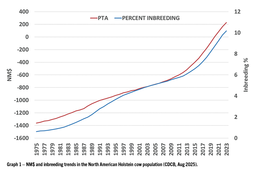 Take home message: The dynamics of genetic diversity and inbreeding are complex. While we know increased inbreeding levels and the consequent decline in genetic diversity are detrimental to population fitness, we have not yet observed any reduction in production or any significant reduction in cow health/wellbeing. On the other hand, improved herd management practices may be masking inbreeding depression. According to Graph 1, there is no slowdown in the rate of genetic progress. This suggests there is enough genetic diversity in the population, and the genetic trend is not yet close to plateauing. Even though current losses due to inbreeding do not appear to be severe, active inbreeding management through the use of diverse sire lines and mating programs is essential for sustainable genetic progress, maintaining animal fitness and safeguarding against accumulation of deleterious alleles. Rest assured, Select Sires is doing everything possible to create genetic diversity in our sire development programs for your benefit over generations yet to come.