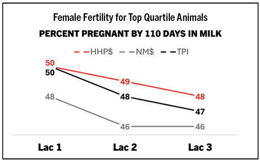 The best HHP$ and TPI cows had similar fertility levels in first lactation and performed slightly better than the high NM$ cows. This shifted slightly in the later lactations as the high HHP$ cows had higher fertility in their second and third lactations than the top cows for TPI and NM$.