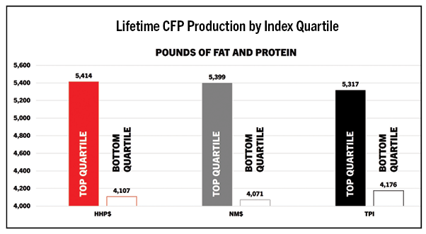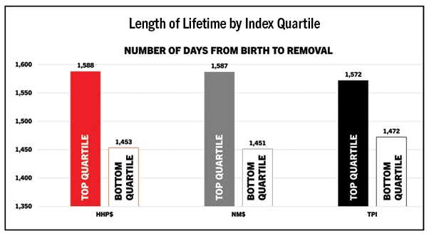 The top-ranking animals for each of the indexes outperformed their herd mates for length of lifetime and lifetime production. Lifetime performance differences for the top quartile animals compared to the bottom quartile were substantial. The top quartile animals for HHP$, NM$ and TPI stayed in the herd at least 100 days longer and produced at least 1,100 more pounds of milk components in their lifetime than their herd mates in the bottom quartile. Animals with top genetic rankings deliver substantially more return regarding phenotype and performance than those with lower genetics.